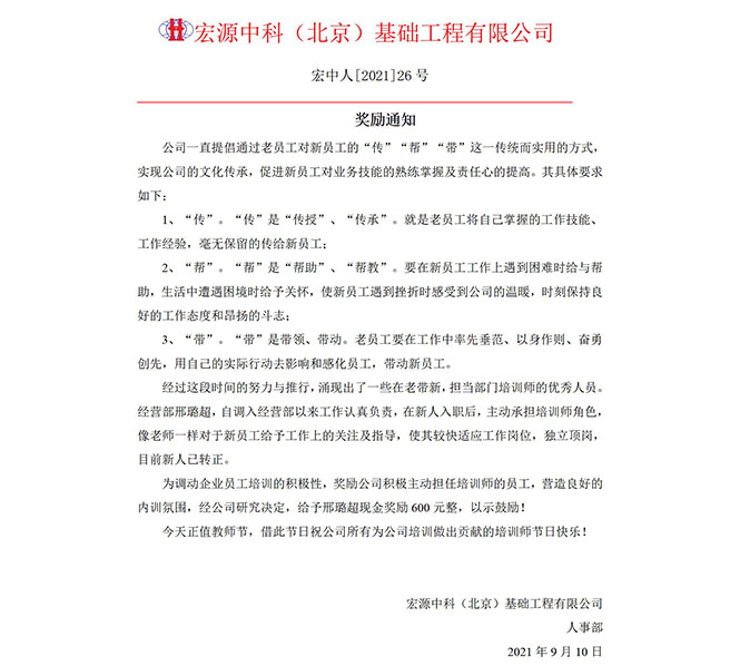 宏源中科一直提倡通過老員工對新員工的“傳”“幫”“帶”這一傳統(tǒng)而實用的方式,實現(xiàn)公司的文化傳承,促進新員工對業(yè)務(wù)技能的熟練掌握及責(zé)任心的提高。